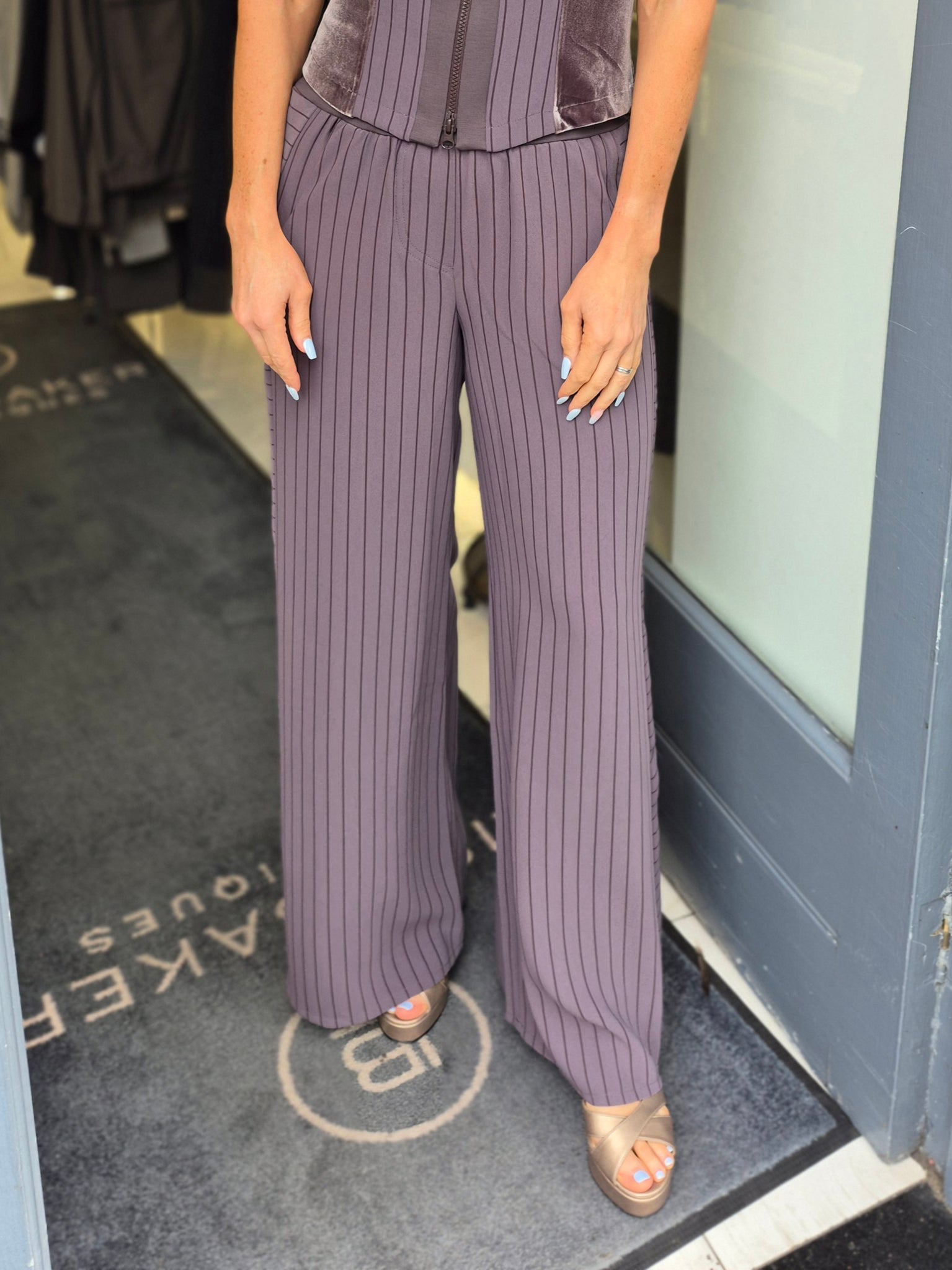 ania schierholt stripe wide leg trousers in mauve