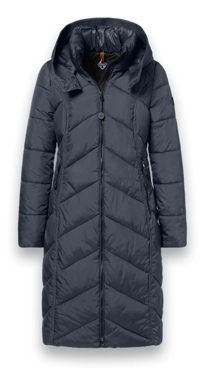 Recycled long fantasy quilted coat, water-repellent, with detachable, large quilted adjustable hood. Two zippered slit pockets with black contrast zippers. Fun logo zipper pullers and logo wind flap behind zipper closure. Inner pocket with button closure. Made from water-repellent materials.