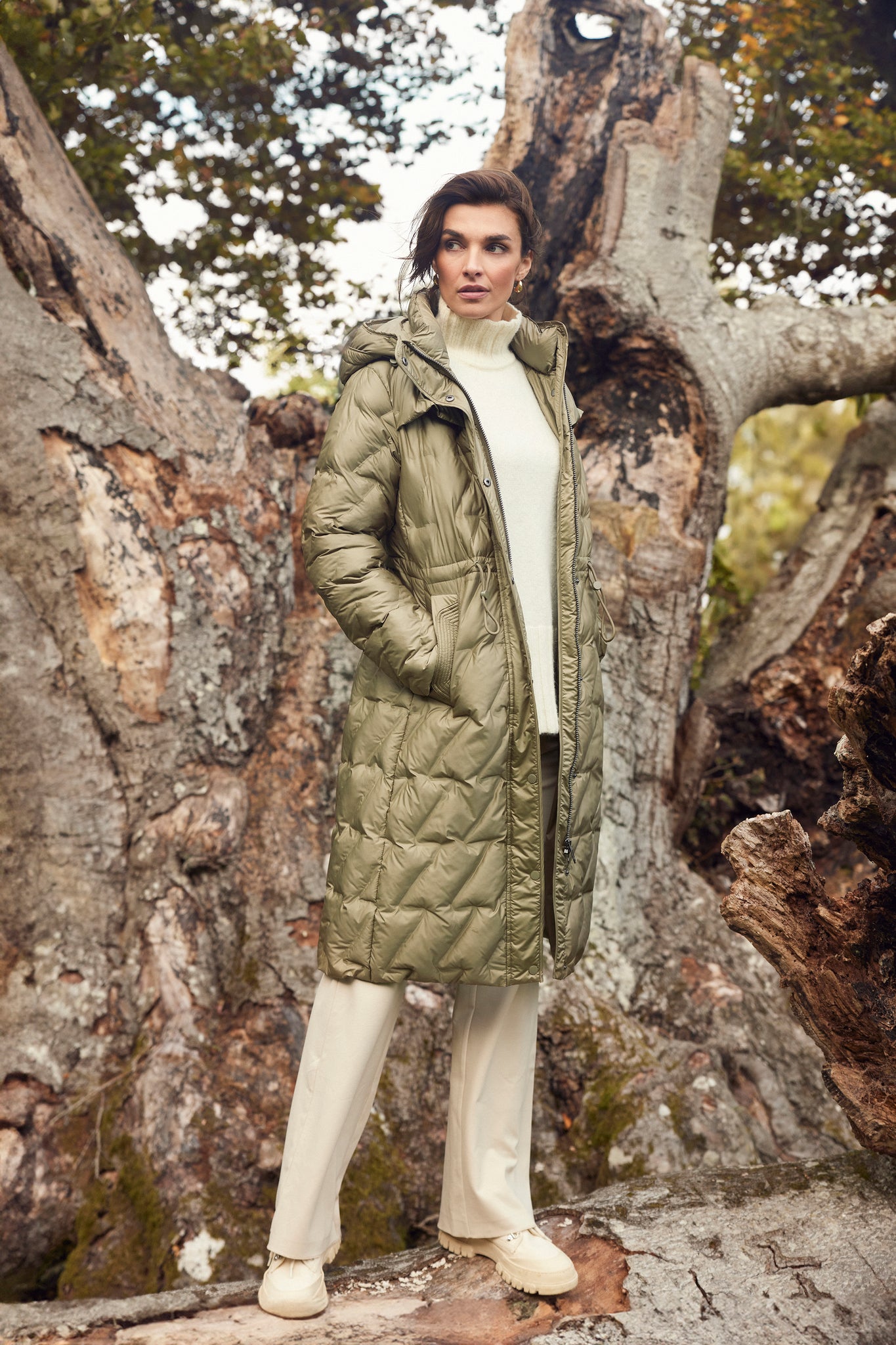 This hooded puffer coat features a flattering midi length and long sleeves for added warmth. It fastens securely with a front zip, making it the perfect combination of style and practicality.