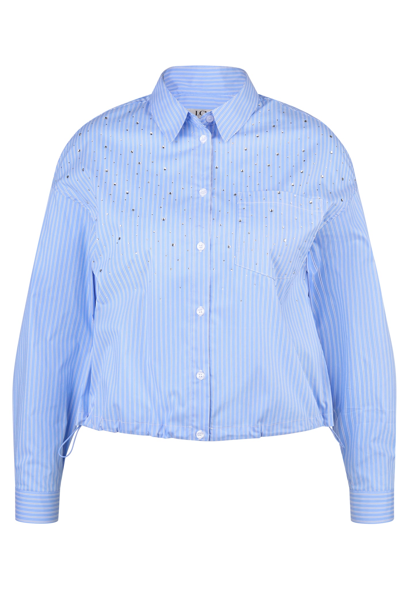 This pinstripe crop shirt features a sophisticated blend of blue and white stripes, accented with subtle diamante detailing for a touch of elegance. Designed with long sleeves and a stylish pocket, it balances classic tailoring with contemporary cropped length. Ideal for adding refined flair to your wardrobe while maintaining comfort