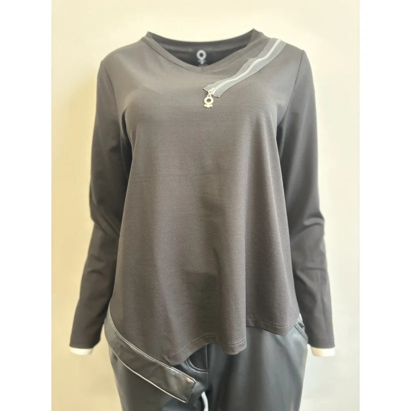 slight vneck style asymmetric hem long sleeve top with zip detail