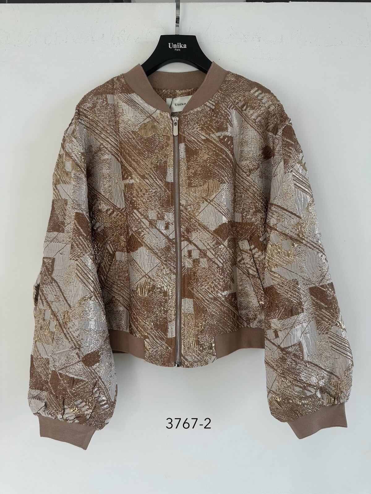 Expertly crafted with a shimmery gold finish, this bomber jacket will elevate any outfit. The sleek zip closure adds a touch of modern sophistication. Stay stylish and on-trend with this must-have statement piece.
