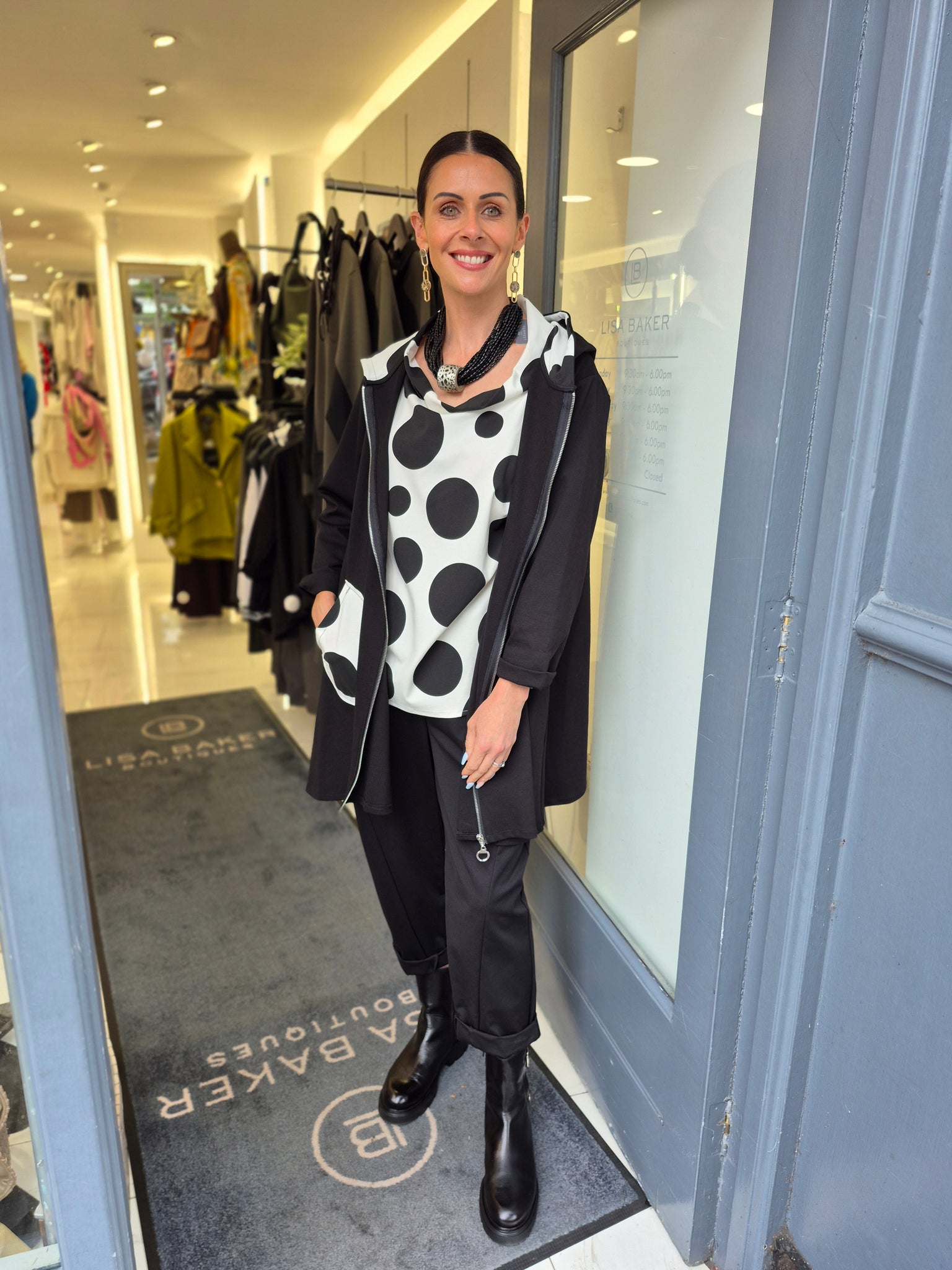 Spot print pocket, hood and back panel detail longline hoodie in black and white.